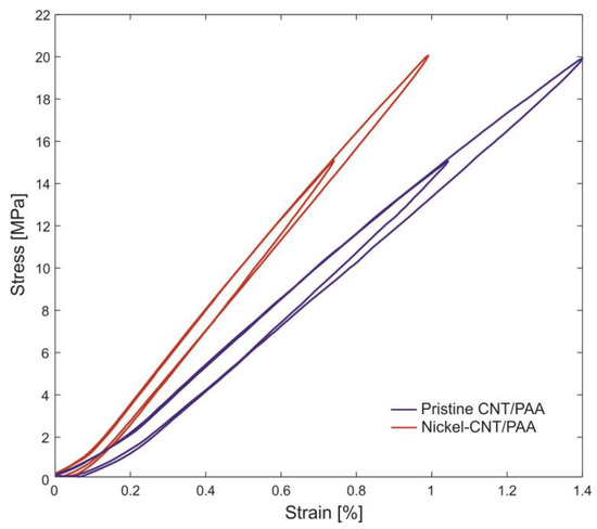 Cyclic tensile tests at a constant force rate of 2 N/min for the pristine CNT/PAA nanocomposite and nickel-coated CNT/PAA nanocomposite. Loading/unloading cycles at two stress amplitudes (15 MPa and 20 MPa, respectively) are obtained per each material.