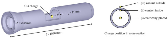 A sketch of the pipe geometry is shown in Figure 1, where the pipe is cut to show the charge. An additional sketch showing the three different charge positions on the cross-section is included on the right. These are (i) centrically placed, (ii) in contact with the pipe on the inside, and (iii) in contact with the pipe on the outside. The total length ℓ of each pipe is 1560 mm, and it has an internal diameter Di = 200 mm and pipe wall thickness tw = 41 mm, thus making the outer diameter Do = 282 mm. At the pipe ends, the geometry is altered to enable construction of a long, continuous drainage pipeline.