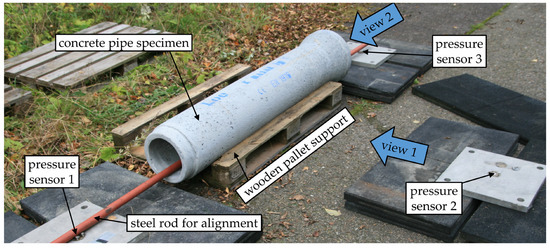 A picture of the test setup is shown in Figure 2. During testing, the concrete pipes rested on a wooden pallet which provided continuous support and prevented the pipes from rolling. Three Kistler piezo-electric pressure sensors at equidistant points from the charge (approximately 1315 mm) were used to record the pressure at a sampling rate of 1 MHz. Sensors 1 and 3 were placed along the main axis of the pipe, while sensor 2 was placed at the same distance from the charge, perpendicular to the main axis. A steel rod was used to align sensors 1 and 3 with the pipe. The pressure sensors were flush mounted on 400 × 400 × 30 mm aluminium plates, thus making sure that they stay in place. The blue arrows in Figure 2 show the direction of the camera views. Two synchronised Phantom v2012 high-speed cameras capturing images at a rate of 22000 frames per second filmed from within protective containers. The C-4 charges placed in the centre of the cross-section were spherical, and placed on a styrofoam support. The contact charges were shaped as cubes for firm contact, and a styrofoam spring was used to ensure contact for the inside contact charges. To ensure proper contact for the outside charges, the detonator cord was tightened to put a slight stress on the charge. The C-4 charges were moulded around the detonator, which is equivalent to approximately 1.0 g of C-4. The detonator is an electrically ignited blasting cap, and the same type was used for all tests.