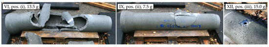 For the smallest centrically placed charge (10.0 g in position (i)), no cracks were noted in the pipe. Increasing the charge size to 12.5 g produced long longitudinal surface cracks along the pipe, but no through-thickness cracks were noted. The pipe maintained its integrity and remained in one piece. A charge of 13.5 g caused the pipe to break into few and large oblong pieces and fragments. Increasing the charge size beyond this would most likely produce more fragments of smaller size. The end sections of the concrete pipes remained whole, so the fragmentation was confined to the central area of the pipe closest to the charge (see the left part of Figure 3).