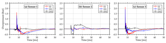 Pressure-time histories from tests with charge size 10.0 g at positions (i), (ii) and (iii), where part (a) shows data from sensor 1, part (b) from sensor 2, and part (c) from sensor 3.