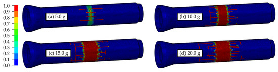 In general, the qualitative results were encouraging. The damage pattern of long longitudinal cracks observed in the experiments was replicated by the simulations as shown in Figure 5. The legend indicates the tensile damage, ranging from 0.0 (no damage) to 1.0 (maximum damage). The tensile damage close to the charge is high, and extends as “cracks” from the central area. As expected, larger charge sizes produce a larger damaged area in the centre of the pipe. For 15.0 g and 20.0 g C-4, the damaged areas are quite similar, but for the latter there are more and longer “cracks” (see parts (c) and (d) of Figure 5).