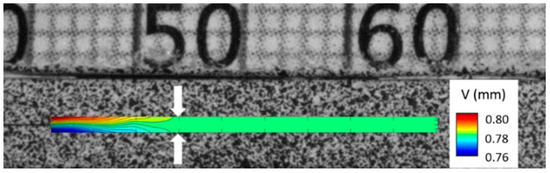A commercial software Vic-3DTM was used to calculate the displacement field at the edge of DCB specimens. The image had the resolution of 1 pixel = 37 μm. The vertical displacement, V, around the delamination crack was obtained, as shown in Figure 1. At the position where the crack exists (from ~46 to ~51 mm), obvious variation of vertical displacement was observed through the specimen thickness because of the crack opening. This variation gradually decreases to zero at ~52 mm, which indicates the end of the crack. Therefore, this zero variation of vertical displacement around the crack path is used as a criterion of determining the crack tip position.