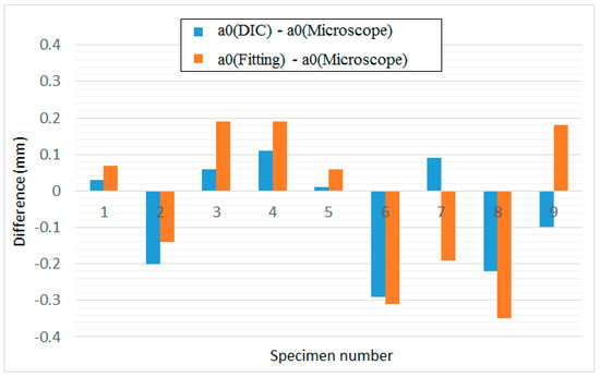 The crack tip detection with DIC was applied to nine different tests, and the initial crack tip position measured from the first cycles, a0(DIC), was recorded. To verify the proposed method, the initial crack length was also measured using microscopy, a0(Microscope), and then compared to a0(DIC). Figure 2 shows the difference between the DIC detection results and microscope observation. The fitted initial crack length, a0(Fitting), was also used to verify the accuracy of Equation (1). It indicates that DIC detection and fitted initial crack length both exhibit a good accuracy, which differs from microscope observation by less than 0.36 mm.