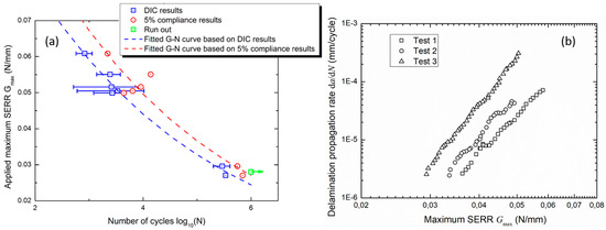 Mode I delamination: (a) G-N curves from DIC method and compliance method; (b) fatigue delamination propagation rate curve.