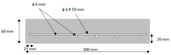 Four RC slabs are examined with the following dimensions: length 2.3 m, width 0.3 m and thickness 0.06 m. The main reinforcement is composed of 6 bars of 6 mm diameter. The steel has a design characteristic yield strength of fy = 500 N/mm2, and a Young’s modulus of Es = 210,000 N/mm2. The average compressive strength is fcm = 53 N/mm2. Only one type of CFRP strip is used for all slabs to be reinforced; it has a length of 1.96 m, a thickness of 2.5 mm and a width of 15 mm. The tensile strength and Young’s modulus of the CFRP (as reported by the manufacture) are 2800 N/mm2 and 165,000 N/mm2, respectively. Figure 1 shows the slab internal reinforcement details.
