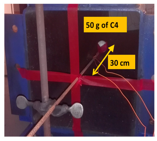 For the second explosion, the charge weight is increased to 50 g of C4 and fixed inside the tube at 30 cm from the entrance of the tube as shown in Figure 4. This measure is necessary to increase the reflected pressure and the reflected impulse applied to the slab.