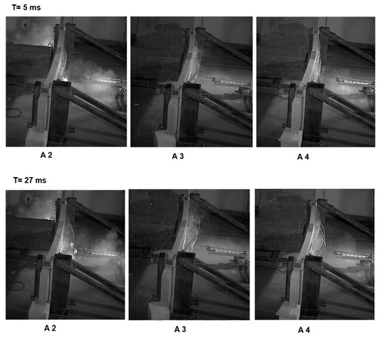 Using a high-speed camera, images are required to record the debonding process during the second explosion. The recorded images show that the total debonding of the CFRP strips occurs at 5 ms after the explosion for all the retrofitted RC slabs and the RC slabs reach the maximum deflection after 27 ms. This is shown in Figure 5.