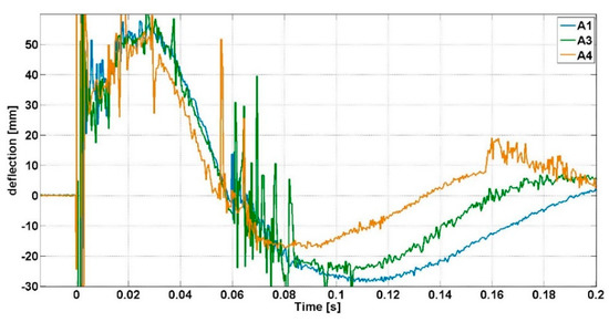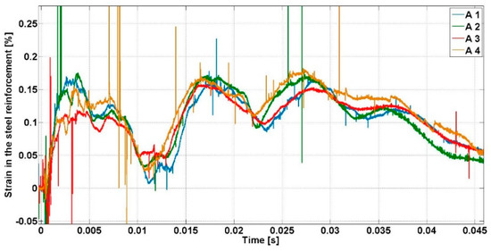 Figure 8 shows the same evolution of the strain in the steel reinforcement during the inbound phase of the second explosion when the total debonding of the CFRP strips occurs. An average of maximum strain equal to 0.16% is recorded at t = 0.027 s for all the tested specimens when the RC slabs reach a maximum deflection.