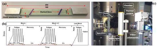 Rectangular glass/epoxy [±45]2s composite specimens with the average dimensions of 250 × 25 × 2.3 mm3 (length × width × thickness) were prepared, according to ASTM D3039 as shown in Figure 1a. Fatigue experiments were performed by applying two types of loading patterns. A continuous constant amplitude fatigue spectrum at different stress levels in order to derive baseline data in terms an S-N curve; and an second loading pattern during which the load was interrupted for two hours repetitively, after cycling for 20% of the fatigue life achieved under continuous loading at the same maximum cyclic stress level. A schematic representation of the interrupted loading program is shown in Figure 1b. The duration of 20% of the fatigue life in each loading block was selected in order to obtain a significant number of interruptions in each fatigue experiment and a reasonable duration of the fatigue experiments. The transition from the mean fatigue loading to the zero-load intervals was achieved in one second.