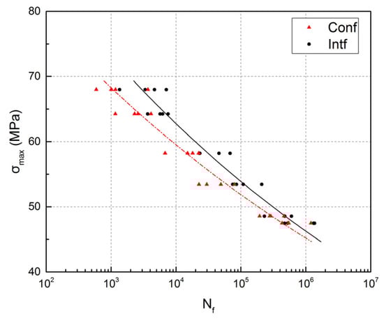The fatigue behavior is shown in Figure 3, where the maximum cyclic stress level, σmax, is plotted versus the number of cycles to failure, Nf. The specimens loaded under the interrupted fatigue pattern sustained significantly more cycles than those loaded continuously until failure. The effect was more pronounced at high stress levels, with average lifetime increases reaching 126% at the level of 68 MPa, while being much moderate at lower stress levels.