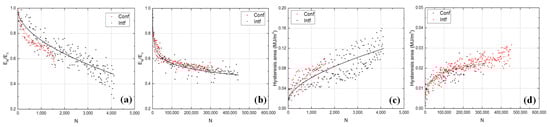 Average normalized fatigue stiffness versus number of cycles loaded at σmax = 68 MPa, (a), σmax = 49 MPa, (b), and average hysteresis area per cycle versus number of cycles at σmax = 68 MPa (c), σmax = 49 MPa, (d).