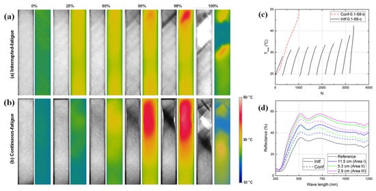 The reflectance results of the UV-Vis-NIR spectroscopy for the reference specimen are shown in Figure 5d by the black solid line. In addition, measurements taken at different positions on the failed specimens at the same distance from the fracture surface are also presented in the same figure. The reflectance of the damaged specimen increased when the measurement was taken at regions closer to the failure location, indicating the accumulation of more damage in this region, with new interfaces and fatigue cracks. A comparison of the measured reflectance between specimens loaded interruptedly and continuously showed that by applying interrupted fatigue loading pattern the reflectance across the specimen length increased. Therefore, according to this technique and the assumption that increased reflectance can be interpreted as increased damage in the specimen volume, more damage was accumulated throughout the specimen, when loaded with interruptions. However, this method does not seem appropriate for capturing all the damage that has occurred; for example, small cracks across the beam of light may not reflect the light, particularly when they close after load removal.