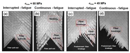 The fatigue fracture surfaces are shown in Figure 6. For all cases, a diagonal damage pattern, following the 45° fiber direction, was observed. For higher stress levels in both loading patterns, the failure was characterized by extensive fiber pull-out, a consequence of the significant deterioration of the matrix/fiber interfaces, which hindered the transfer of the stresses from the matrix to the fibers at the concentrated damage zones. In addition, it was observed that the necking was more pronounced under continuous fatigue loading. At lower stress levels, a mixed-mode failure with fiber pull-out and fiber breakage was observed with predominant fiber breakage at the lowest stress level. The presence of fiber breakage at low stress levels was attributed to the more uniform and less severe damage distribution, which allowed the matrix and interface to transfer stresses to the fibers.
