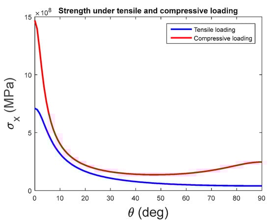 Figure 1 shows that at , Pa and Pa. The two values compare favourably with the health of the composite material since they are smaller than that of the ultimate strengths. However, when , the tensile and compressive loading are decreasing exponentially until at angle of 90°.