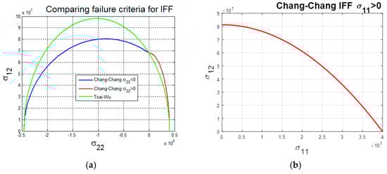 Chang-Chang and Tsai-Wu interfibre fracture; (a) Comparing failure criteria for IFF when and . (b) IFF when .