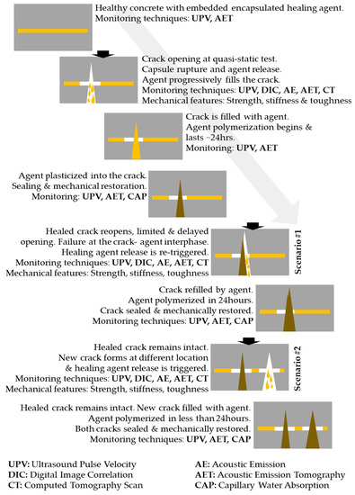 The contributions overview of each monitoring method applied in self-healing concrete studies is illustrated in the configuration in Figure 3 and briefly described at the following paragraphs.