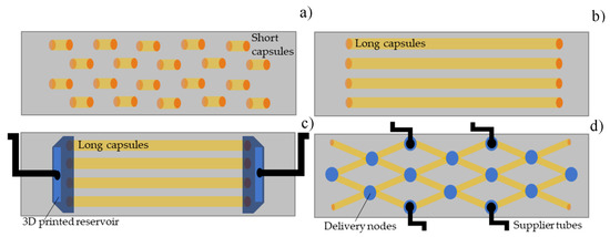 The dawn of a new era in self-healing concrete is set around 2015 with a series of feasibility studies and projects that investigate the design of vascular networks carrying healing agent aiming to provide repetitive sealing and mechanical repair this time in real-size construction elements (1D/2D slab, beam, wall) [14,15,16]. The agent is partly stored into long thin capsules [17] that additionally provide beneficial impact on concrete toughness and partly into reservoirs connected to the capsules and attached to the concrete element (Figure 2c,d). Internal pressure controls the agent release in the presence of the cracks that break the capsule. The agent circulates into the capsule network due to capillary forces achieving simultaneous cracks healing at different locations in concrete. Repeatable healing is feasible since additional healing agent can be delivered through the reservoirs. This optimized healing system permits two crack scenarios: