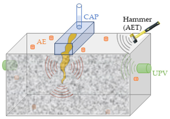 - Grosse, C.; Malm, F. Combination of inspection and monitoring techniques for the detection of fractures in concrete with self-healing properties. In Proceedings of the FraMCoS-9, Berkley, CA, USA, 29 May–1 June 2016. [Google Scholar]