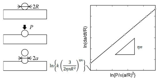 In the high-temperature indentation creep test, the relationship between the impression size and the testing time is obtained by indenting a specimen with a spherical ball under a high-temperature environment. The creep exponent and creep coefficient in the Norton’s law can be estimated from the relationship. The estimation method is as follows.