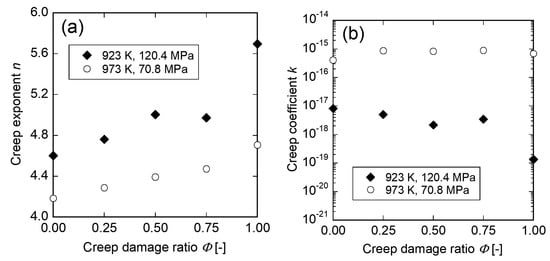 Figure 4 shows the creep exponent and creep coefficient evaluated by the high-temperature creep indentation test as a function of creep damage ratio. In Figure 4a, the creep exponent linearly increases as the creep damage ratio increases in each specimen. Further, the specimen damaged under the condition of 923 K and 120.4 MPa has larger creep exponent than the specimen damaged under the condition of 973 K and 70.8 MPa. In contrast, the creep coefficient slightly decreases as the creep damage ratio increases. In addition, the specimen damaged under the condition of 923 K and 120.4 MPa has smaller creep coefficient than the specimen damaged under the condition of 973 K and 70.8 MPa. These results imply that the creep life can be predicted by using the creep exponent and creep coefficient.
