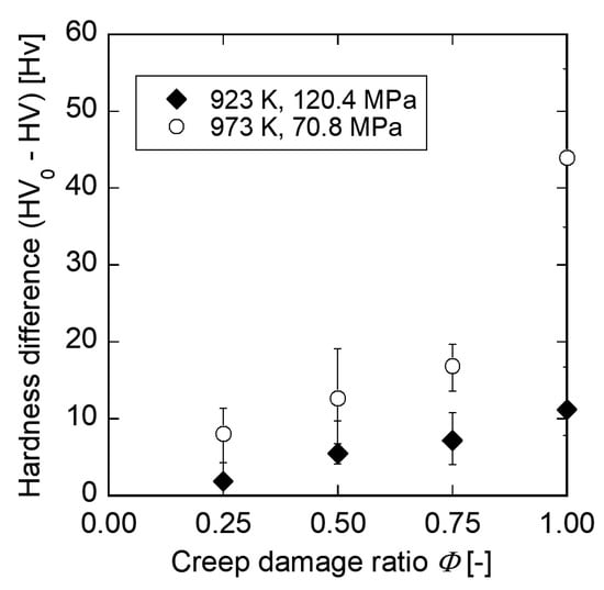 As an instance of conventional creep life prediction methods, Vickers hardness method was applied to the specimens prepared in Section 2.2. The relationship between the hardness difference and creep damage ratio is shown in Figure 5. The Vickers hardness difference represents the difference between the Vickers hardnesses of the grip part (HV0) and testing area (HV) in the interrupted specimen. The Vickers hardness difference monotonically increases as the creep damage ratio increases. However, the Vickers hardness difference varies strongly depending on the temperature and stress levels which the specimens have experienced, even though the specimens have same creep damage ratio each other. Therefore, in order to apply the Vickers hardness method to actual components, we have to preliminarily obtain the relationship between the hardness difference and creep damage ratio in various temperature and stress conditions.