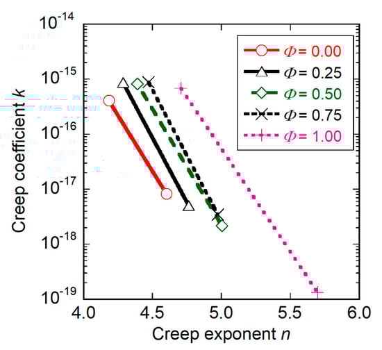 If the A is constant, the logarithm of B can be determined by the creep exponent and creep coefficient obtained through the high-temperature indentation creep test. The gradient of approximate line for the unused specimen (Φ = 0.0) shown in Figure 6 was employed as the constant A.