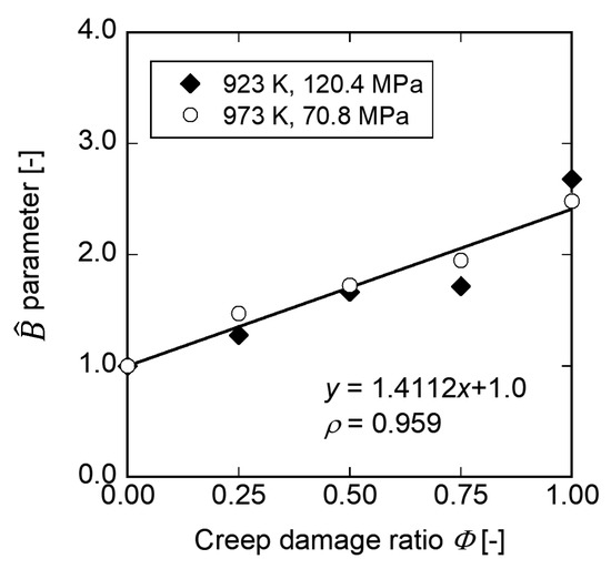The logarithm of B normalized by the logarithm of B0, which is denoted by , is plotted as a function of the creep damage ratio in Figure 7. The logarithm of B0 is obtained from the unused specimen using Equation (7). In Figure 7, the linearly increases as the creep damage ratio increases. Furthermore, the is not affected by the temperature and stress conditions. The approximate line is expressed as,