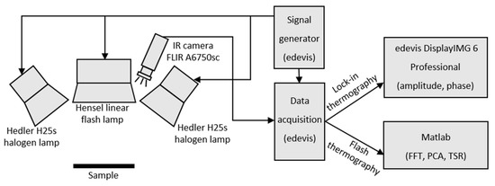 All tests are performed in reflection mode, i.e., optical excitation and infrared camera at the same side, with the sample mounted at a distance of ~70 cm from the excitation (to ensure that sufficient energy is transmitted to the sample). The infrared camera is a FLIR A6750sc, which has a cryo-cooled InSb detector with a pixel density of 640 × 512 pixels, a noise equivalent temperature difference (NETD) of <20 mK and a bit depth of 14 bit. An internal infrared filter is installed, which narrows the camera’s spectral range from 1–5 µm to 3–5 µm. For the lock-in excitation, two halogen lamps of the Hedler H25s type are used, each covered with two PMMA shields to filter their infrared interference. The halogen lamps each have a nominal power of 2 kW, and are connected to an edevis signal generator, which allows the user to define the desired modulation for the excitation. The flash excitation originates from a Hensel linear flash lamp with a nominal energy of 6 kJ that delivers a flash with a duration of around 10 ms. All experiments are performed with a fully synchronized edevis hardware and software thermographic system which ensures the accuracy of triggering and data acquisition. The post-processing of the thermographic data is performed with the edevis DisplayIMG 6 Professional software and further with Matlab for more advanced analysis.