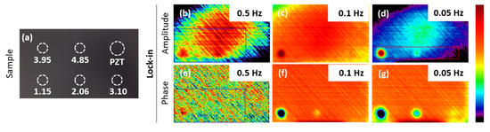 Figure 2a shows the sample with its defects and their depths, and Figure 2b–g present the lock-in results obtained for the CFRP with flat bottom holes. The amplitude results at the various frequencies are shown in the first row (Figure 2b–d), while corresponding phase images are presented in the second row (Figure 2e–g).
