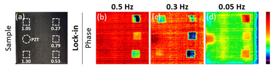 The lock-in results (phase images) of three frequencies for the sample with inserts are presented in Figure 4b–d, while an overview of the defect locations and depths is shown in Figure 4a.