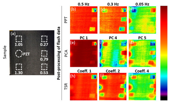 Results of the post-processing of the thermographic data, together with an image of the sample, are presented in Figure 5. The PCs and TSR coefficients are different to those in Figure 3 in order to present additional information. The results of PPT at the lock-in frequencies (0.5 Hz, 0.3 Hz and 0.05 Hz) are displayed in Figure 5c,d. It is remarkable that the PPT image of 0.05 Hz does not match its lock-in counterpart (Figure 4d), while the images for the other frequencies (lock-in and PPT at 0.5 Hz and 0.3 Hz) are comparable. We are currently investigating the origin of these counter-intuitive results. The fifth PC, given in Figure 5g, is the principal component that displays the defects the clearest. Though, the fourth and fifth principal component (Figure 5f–g), present some non-uniformity in the central area, which can be wrongfully interpreted as being a defected area. In the second and fourth TSR coefficients (Figure 5i–j), all five inserts can be readily detected, but there is also a large edge effect at their right side. This is the side where the sample was clamped during the experiments, and thus caused a different cooling rate at this location. This is very pronounced for these TSR images, while other post-processing methods exhibit little to no influence from this. The influence from the clamping is barely visible in the first polynomial coefficient (Figure 5h), which could indicate that localized gradients in the heat diffusion are dominantly captured by the higher order coefficients of TSR. The self-contrast of the top-right defect as evidenced in the lock-in results at 0.5 Hz (Figure 4b) is also prominent in the first PC (Figure 5e) and the first TSR coefficient (Figure 5h).