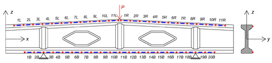 The FBG sensors setup. 1L-11L and 1R-11R correspond to the FBGs of the two fibers of the top flange. 1B-20B correspond to the FBGs of the bottom flange fiber. The quasi-static force P for the PDT is applied in the direction of the red arrow.