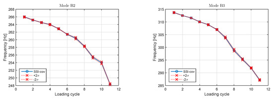 The evolution of the eigenfrequencies throughout the PDT is shown in Figure 3. The presented eigenfrequencies correspond to the decoupled modes B2 and B3. A similar trend is observed for the decoupled modes L1 and L2 and thus they are not presented. For the damage-sensitive modes, a constant reduction of their eigenfrequency values is observed, which is correlated with the increased level of damage of the beam. The percentile reduction of the eigenfrequency values varies from to for the different modes, depending on the degree that each mode is influenced by the damage.