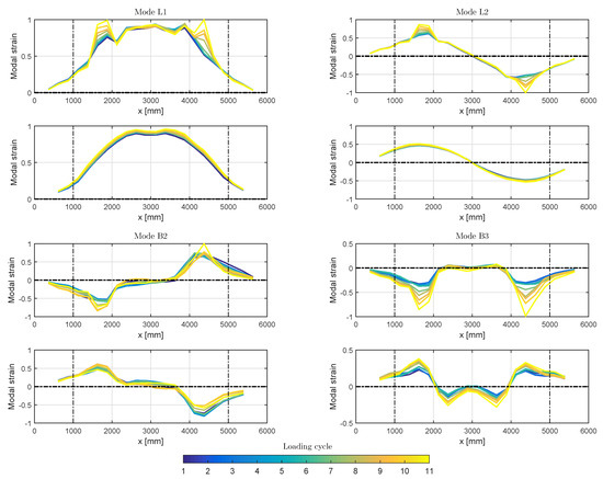 Significant amplitude and curvature changes are observed in the vicinity of the damaged area (around the openings of the web), as it can be seen from the strain mode shapes in Figure 4. The increase in curvature and amplitude is directly related to the decrease of stiffness at certain locations of the beam (around 1500 mm and 4500 mm) where shear cracks were observed during the experiment. The evolution of the strain mode shapes during the different loading cycles is prominent. The larger amplitude values correspond to the last loading cycle, before the failure of the beam. The top flange strain mode shapes appear to be more sensitive to damage, which is in agreement with the observations during the experiment where most of the cracks were formed at the top of the beam. However, both the top and the bottom strain mode shape of the third bending mode (mode B3—Figure 4d) are influenced from the damage allowing in this way to identify also damage of moderate severity at the bottom flange of the beam.