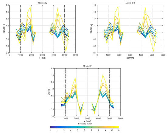 where is the absolute value of the longitudinal modal strain at the top of the beam, is the absolute value of the longitudinal modal strain at the bottom of the beam, and x denotes, as before, the longitudinal coordinate. The TBSR is computed for the well-identified strain mode shapes of the in plane bending modes, B2 and B3. At the locations that the modal strains are approximating zero, mainly in the zone between 2700–3300 mm, the criterion is not applied since the division by very small quantities can yield inaccurate results. As can be clearly seen in Figure 5, where the evolution of the TBSR values along the beam for modes B2 and B3 throughout the PDT are given, the influence of the damage is significant. A clear increase or decrease of the TBSR at the locations where the damaged was mainly observed during the PDT, indicates its high sensitivity as a damage indicator. These changes appear already from the second loading cycle and become really apparent after the sixth loading cycle. The largest changes are observed at the zones around 1500 mm and 4500 mm, where the most severe cracks were observed during the PDT. There, the TBSR values have a percentile increase of up to between the undamaged beam and the damaged beam of the last loading cycle. Therefore, the TBSR is considered as a high sensitivity measure of the level of damage.