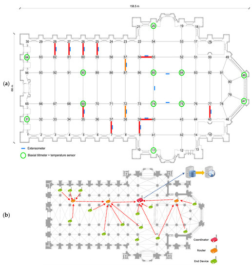 (a) Distribution of the static monitoring sensors inside the Milan Cathedral (dimensions in m); (b) Schematic of the wireless data acquisition and transmission.