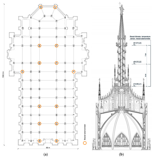 Figure 4. Distribution of the seismometers (a) inside the Milan Cathedral and (b) along the main spire (dimensions in m). - 15 sensors, integrated with each bi-axial tilt meter, to measure air temperature and relative humidity. The temperature range is between −20 °C and +60 °C (with a resolution of 0.2 °C), whereas the relative humidity range varies from 0% to 100% (with a resolution of 1%);