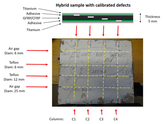 The sample is a hybrid sandwich metal-composite flat panel (Figure 1). It is composed of an epoxy core reinforced by successive carbon and glass fiber plies. The skins are made of titanium, glued to the core by means of epoxy adhesive films. The global thickness of the panel is 5 mm. Series of defects are arranged at the intersection between lines and columns, such as displayed in Figure 1. Column 1 (C1) represent defects the closest to the upper surface, whereas C4 are those the closest to the lower one. They are located at the adhesive layer. Columns C2 and C3 correspond to defects located in the composite core. Each line corresponds to a give type and diameter of defect: air gaps of 6 or 25 mm for the external lines, or teflon inserts of 6 or 12 mm for central lines.