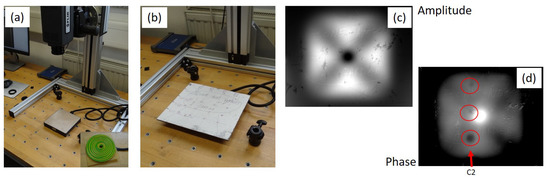 Inductive thermography (IT) induces eddy currents in a specimen which are visualized using an infrared camera. Inhomogeneities in the eddy current distribution indicate material defects. As measurement result, the time lag between inductive excitation and thermal response is evaluated, providing an extremely robust signal, which is insensitive to irregularities or impurities of the component surface. IT is usually used for metallic samples crack detection, but other materials can be investigated too [6,7]. Parameters of importance are electromagnetic skin depth (ESD) and thermal penetration depth (TPD) which depend on the material, as well as to the frequency of the inductor. At 100 kHz frequency, titanium’s ESD is around 2 mm and TPD 1.5 mm. For CFRP, ESD is 50 mm and TPD is 1.2 mm [7]. Here we have a mix of CFRP/GFRP core for which these properties are not known. However, if we extrapolate the values of CFRP, we see that we should be able to observe the defects located close to the front side, for an inductor placed at the back side of our sample and which produces the heat flow passing through the sample. The induction system is a circular inductor placed behind the sample (Figure 3a,b). The camera is a FLIR A6751sc with frame rate of 125 Hz. Different frequencies of the inductor have been tested. The only one which gave observable results is 25 kHz. The Pulse-Phase method has been applied [6]. Figure 3c,d show respectively the amplitude and phase for a Fourier frequency 0.1 Hz. Defects of column C2 can be observed in the phase part. They correspond to defect inside the core. Unhappily, the technique does not provide a clear map of defects, contrarily to other types of excitation. We clearly see here that the phase image is affected by a pattern related to the form of the coil, as is also visible in the amplitude image.