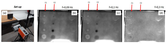 Optical excited Lock-in thermography (OLT) makes use of modulated halogen lamps. The penetration depth of thermal waves depends on the thermal diffusivity and the modulation frequency of the lamp as . Because of their lower diffusivity than metals, composites like CFRP or GFRP require lower modulation frequencies to be penetrated by a thermal wave in order to see subsurface defects. The lower the frequency, the deeper the defect observed. In the case of our sample, this situation is favorable since such low frequency thermal wave will easily pass through the metallic skin. The OLT technique consists in choosing an adequate modulation frequency of the halogen lamp and recording a set of 4 thermograms at each quarter of the modulation period. A simple algorithm is used to retrieve the amplitude and phase of the thermal wave [8]. The defects are generally well observed in the phase images, as phase variations with respect to the surrounding material. Figure 4a shows the set-up: the camera is an IRCAM Equus 327 k. Phase images obtained at various lamp modulation frequencies (Figure 4b–d). For the highest frequency (Figure 4d), only the larger defect, close to the surface (column C1)) in visible. Lower frequencies allow probing deeper, as is show in Figure 4b,c.