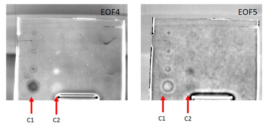 Optical excited pulse thermography results with PCA: two of EOFs showing the defects on columns C1 and C2.