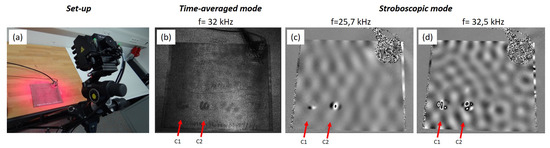 In the case of vibration, different methods are generally used. In all cases, vibration if provided by a shaker attached on the object (Figure 6a) and vibrating at a single sinusoidal frequency. The signal of defects appears very well defined frequencies due to the resonance effect. The first mode is the time-averaged mode in which the shearograms are integrated by the camera over a very long time compared to object oscillation period. The surface appears not deformed except for the defects. (Figure 6b shows the fringe pattern for excitation of 32 kHz. Such an image is not always easy to be used for finding defects signatures since it is affected by the uneven reflecting properties of the object. The stroboscopic mode can be used. Here the PS can be applied, but it requires to modulate stroboscopically the illumination laser in synchronization with the vibration. Results at two frequencies are shown in Figure 6c,d. The signature of air gaps of 25 mm diameter close to the surface are well visible, but stationary waves observed on the whole sample disturb the images.