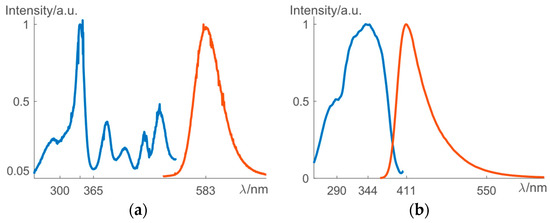 The photoluminescence emission (orange) and excitation spectra (blue) of (a) ZnS:1%Mn2+ and (b) (Ca0.4Sr0.6)Al2Si2O8:1%Eu2+, 1%Ho3+. Both phosphors are excitable at 365 nm.