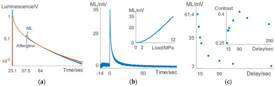 For tensile tests of (Ca0.4Sr0.6)Al2Si2O8:1%Eu2+, 1%Ho3+, (a) the magnitude of ML + afterglow (blue) drops below its afterglow (orange) at a certain time, (b) the net ML tail (delay 15 s) lasts tens of seconds and ML is linear with load upon loading after a threshold of ~2 MPa (inset), and (c) the peak of net ML decreases with delay time, leading to a maximal ML contrast at a delay of 90 s (the inset).