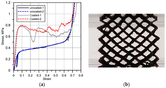 Figure 2a gives results for two uncoated tests and two coated tests. Figure 2b gives the collapse modes for a coated case. The collapse mode was similar to the uncoated case [3,4,5], and essentially micro strut collapse is dominated by plastic hinges in the vicinity of the micro lattice node. This failure mode has been discussed in detail in [3,4,5]. Figure 2a shows good reproducibility for the uncoated case. There is more variability in the coated case. There is increased block stiffness and strength, but subsequent failure and collapse is more variable. For the coated case, as a strut bends around a node, tensile strains at the outer surface of the strut will cause rupture of the coating. Also, there may be shear stresses (and failure) at the core—coating interface, due to material stiffness mismatch. There will be a complex three dimensional failure process. The presence of inclusions will also initiate failure. Hence, there is scope to refine the coating process to improve this variability.