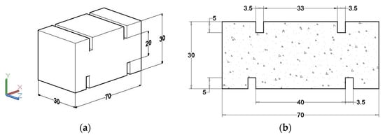 The concrete sample tested is a parallelepiped which has a length of 70 mm, a height of 30 mm and a width of 30 mm. Two notches of 5 mm are drilled on the top and bottom faces which leaves a shear ligament of 20 mm height. The outer length of the top drill and the inner length of the bottom drill have the same dimensions so that the fracture surface remains as vertical as possible. The geometry of the concrete sample is shown in Figure 1.