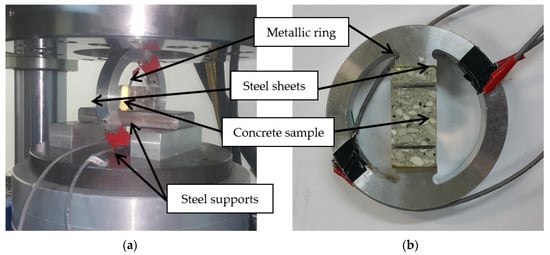 The experimental setup developed for the pre-confinement is presented in Figure 2. It consists in deforming elastically an instrumented metallic ring and inserting the concrete specimen inside the ring. When the load is released, confinement stresses are transferred to the ligament of the sample (in the X direction). The gap between the ring and the concrete sample is filled with steel sheets before the unloading stage. Without these sheets, the ring goes back to its initial position without any confinement in the concrete sample. By varying the number of steel sheets, different levels of confinement can be obtained before applying the shear loading.