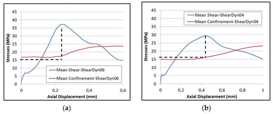 (a) Results of dynamic shear tests performed with an aluminium ring on (a) dry and (b) wet R30A7 concrete specimens.