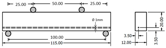 Ti-6Al-4V specimens inside a four-point bending fatigue test setup. Dimensions are in [mm].